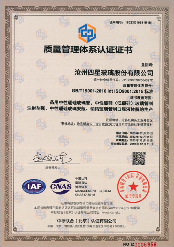 DMF西林瓶認證證書