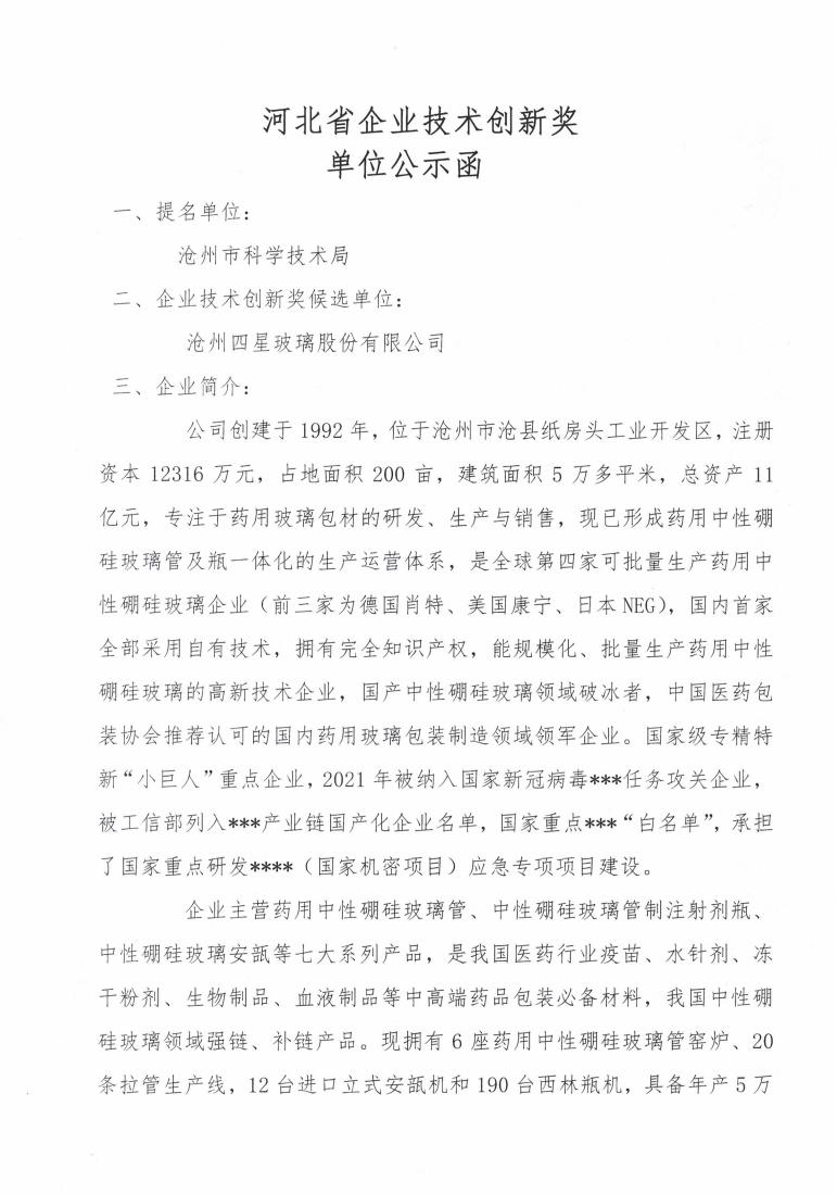 河北省企業技術創新獎單位公示函